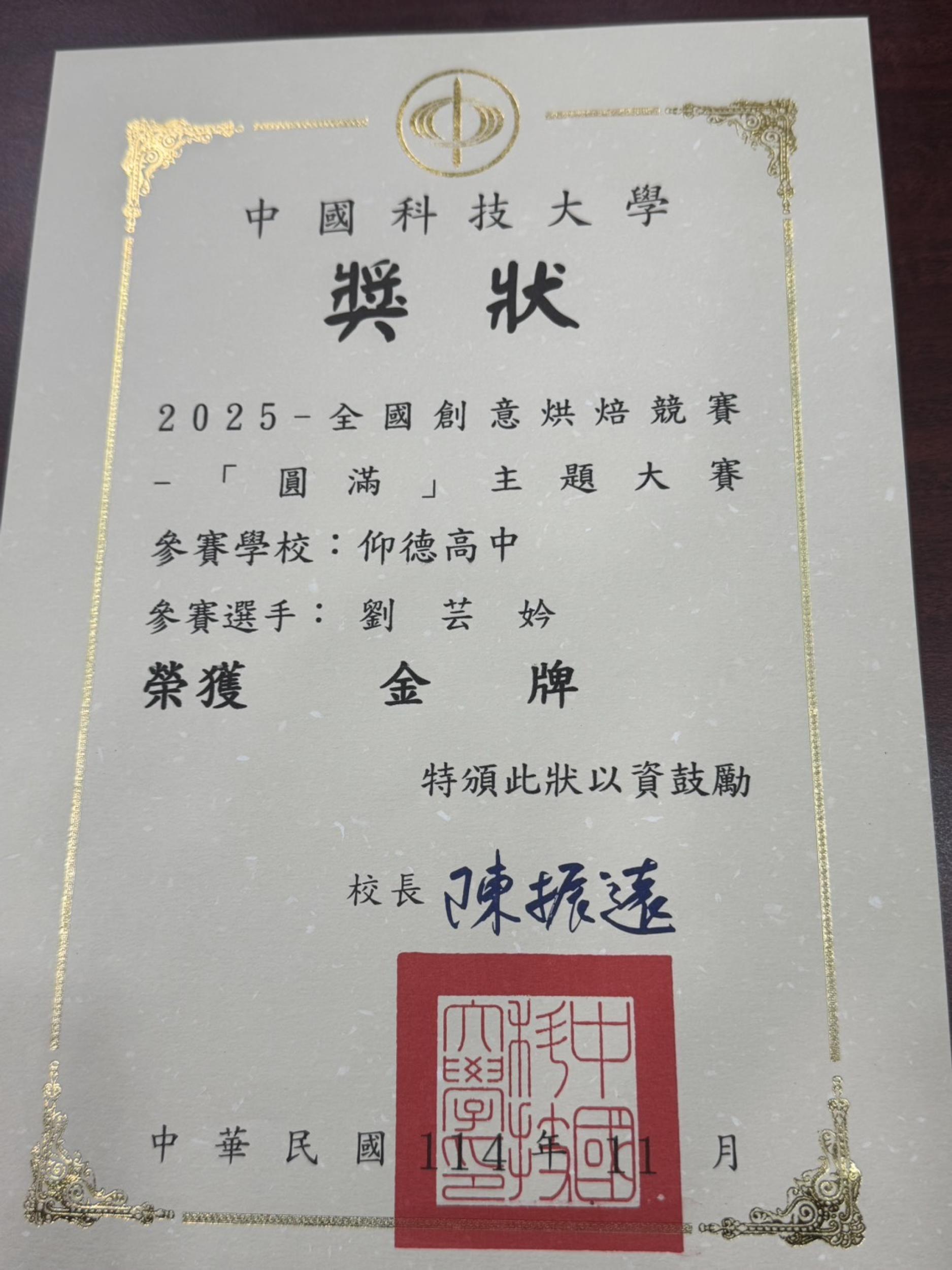 餐飲管理科!參加中國科技大學「2025-全國創意烘焙競賽-「圓滿」主題大賽-巴斯克蛋糕組,榮獲金牌